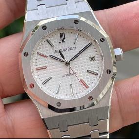 36/37mm, épaisseur de 8mm. Boitier monobloc comme on en faisait jadis. Référence 15790, mark 1 avec le “A” et le “P” de la même hauteur que les autres lettres (seule différence avec la marque 2). Confort inégalé, le bracelet intégré épouse le poignet merveilleusement, la petite tapisserie danse avec la lumière et le biton donne un côté élégant et différencie cette Royal Oak des autres. Quick set date, belle précision et ce bracelet…tout à été dit mais oui tous les superlatifs sont appropriés. Aussi à l’aise avec un jeans T-shirt qu’avec un costume. Moins chère que ses petites copines en acier, allez comprendre :)