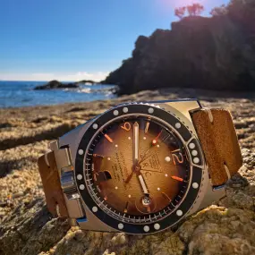 J'aime particulièrement l'originalité de cette montre, à la fois pour son cadran et son aiguille GMT très discrète. J'apprécie la fonction GMT pour son affichage sur 24h, plus pour son aspect esthétique que pour mon usage personnel, n'étant pas un grand voyageur. Ici la lecture de l'heure est rapide car elle n'est pas perturbée par une aiguille GMT trop présente. J'aime également son élégance et sa relative finesse. Une autre originalité est l'association entre fonction GMT et plongée. La luminescence est excellente tout en gardant une belle élégance.