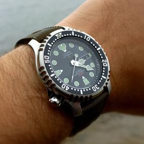 Ma Citizen Promaster est unique. Je cherchais une montre-outil d’occasion, avec des critères simples : une alternative à la Seiko SKX, offrant des caractéristiques similaires. En me baladant sur Vinted, je suis tombé sur cette beauté un peu particulière. En effet, comme on peut le voir sur les photos, les aiguilles, la lunette et le cadran diffèrent d’une NY0040 classique. J’ai donc commencé mon enquête. Les composants proviennent de la Citizen 2300, le modèle précédent. En poursuivant mes recherches, j’ai appris que cette montre a été fabriquée en septembre 1996, en pleine période de transition chez Citizen. Je l’ai achetée avant tout pour son cadran : il est texturé, car Citizen testait alors plusieurs configurations avant la sortie officielle du modèle. Ils ont finalement opté pour un cadran laqué, ce qui rend cette version d’autant plus intéressante et rare. Mon adjectif serait: Transitionnelle -transition industrielle -transition technique -transition historique