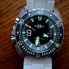 The Bohen Grande Marine truly impressed me with its balance of performance and elegance. For a dive watch capable of reaching 600 meters, its slimness is remarkable: barely 12.8 mm thick, making it far more comfortable on the wrist than most dive watches. You can feel the true technical mastery behind this compact design. It remains a true tool watch, with its helium escape valve, ceramic bezel, and thick sapphire crystal, but it also manages to maintain a refined look for everyday wear. The two included rubber straps, black and brown, are incredibly comfortable—supple, well-finished, and perfect for switching between urban and dive-ready styles. In short, the Grande Marine combines the robustness of a professional watch with the slimness of a dress watch: a piece that is technical, elegant, and surprisingly comfortable. So you can start your evening with a mission in murky waters and end it in a helicopter in Gstaad ;-)