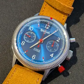 Here's my Avigation BigEye in titanium, a watch with a retro look but cutting-edge engineering and performance. It's currently the most accurate watch in my collection, with an accuracy of -1 to +1, and yet it's not COSC certified. The column chronograph is very smooth to operate. I love the deep blue dial with its smoky, grained finish that gives it a beautiful depth. The raised crystal case further enhances this effect. The lightness of the titanium and its 41mm diameter make it very comfortable to wear.