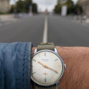 I bought this watch for a visual on the Hector Guimard metro signs diverted into an Oxygen station. It was a misunderstanding. In reality, this watch does not make me think at all of Guimard's universe, nor even of the Parisian metro. When I see it, I do not hear the RATP sound signal but the "zurückbleiben bitte!" of the U-Bahn. It makes me think more of Berlin and reminds me of the design of a Wostok that I wear sometimes (and which must itself be inspired by German models like those of Junghans for example). That said, it is a very correct little watch. The Miyota caliber is very reliable, there is nothing to complain about. The sound of its beats is rather pleasant, even if the automatic balance makes a spinning top noise. The back is transparent, even if the weight is not particularly decorated. We can see this functional movement beating and the oscillating weight spinning. The hands have a luminova treatment in the center and four chips indicate the four dial markers in the dark. The leather strap is simple but sturdy and very successful. For the soundtrack I hesitate a lot between piano improvisations or electronic music, in any case crossed influences between France and Germany. Maybe we will then choose Kompromat (https://www.youtube.com/watch?v=KeCHQdUapk0 ) to show that the French can also make German music or Kraftwerk to show that the Germans can also make the soundtrack of the Tour de France (https://www.youtube.com/watch?v=invtIKKl2Hw ). Adjective: Germanic, Parisian, Simple, Industrial, refined, reliable, European