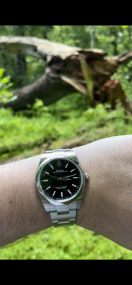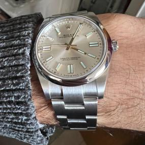 An iconic model, the original Oyster, with three hands and double cardinal hour markers. A crowned yet discreet design, sporty yet elegant, it suits everything. This OP is essential to me; it's simple and indispensable. The lacquered dial, with its ever-changing shades of vibrant color, sometimes deep and bold, sometimes dark, is timeless.