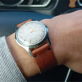 Listen while reading: Aphex Twin - Polynomial-C. This Strela Blue Sky pays tribute to the Soviet cosmonaut Alexei Leonov. On March 19, 1965, he became the first human to perform a spacewalk during the Voskhod II mission. “I was stepping into the unknown, and no one in the world could tell me what I would encounter. I had no instruction manual. It was the first time. But I knew it had to be done [...]. I climbed out of the hatch without hurrying and carefully extricated myself. I moved away from the spacecraft little by little [...]. The silence was awe-inspiring, so heavy and so profound that I began to hear the sounds of my own body [...]. The Earth seemed small, blue, clear, so tender, so lonely. It was our home, and I had to defend it like a sacred relic. It was perfectly round.” I don't think I ever knew what "round" meant until I saw Earth from space. It was the return to the spacecraft that posed a problem: the sudden drop in pressure in space caused his spacesuit to inflate, preventing him from entering the airlock. Time was of the essence because his oxygen supply was dwindling; he would have to deflate it himself using a valve, risking a gas embolism if the decompression was too rapid. He entered headfirst, not feet first as the procedure required, but he was saved! "Strela" means "arrow" in Russian; Alexei Leonov wore a Poljot Strela chronograph during this mission. Specs: 3 ATM water resistance, 40 mm diameter, 11.8 mm height, 47 mm lug to lug. Poljot manual caliber 2609, 2.5Hz, 40-hour power reserve. The strap is a 20mm Vostok, which is very comfortable and adjustable to the millimeter. The dial appealed to me more than the case, which is rather generic. The outer edge features the blue of the cosmos, while the center represents the Earth with the equator between 9 and 3 o'clock. The northern hemisphere is brushed vertically, while the southern hemisphere is brushed horizontally. This configuration, with the blue border, visually slims the watch; at 40mm, it looks smaller on my slender wrist. The Cyrillic inscriptions are essential to me; it's this characteristic of Russian watches that I appreciate. The export models with the Latin alphabet, which were sold in the West during the Soviet era, don't interest me at all. (See my review of my Raketa Baltika.) "Strela 17 jewels, manual caliber 2609, made in Russia" On the case back: "Strela, First Hours of Cosmos Discovery 1965". My presentation at the La Baule Meetup in summer 2025: https://m.youtube.com/shorts/UVr7B2KeBDo
