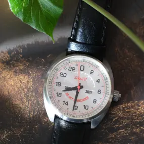 This Vostok Kadet model with its light blue dial exudes an extraordinary freshness. The diameter is compact, measuring 39 mm including the bezel, and the crown is positioned at 1:30 so as not to interfere with the side of the wrist. It's worth noting, however, that some people, like Vladimir Putin, have made a habit of wearing their watches on their right wrist to avoid having the crown at 3 o'clock, when simply not having the crown at 3 o'clock would suffice. The numerals appear to drift away from the center, following the direction of centrifugal force, except for those in the lower section, which are inverted (the 4, 5, 6, 7, and 8 are in a centripetal position for improved legibility). The watch is quite light for a dive watch: 38g. The caliber is a 17-jewel Vostok 2409A. The difficulty lies in the winding system with the screw-down crown; it never works on the first try. This is probably the price you pay for a waterproof watch from Vostok. And that's why the automatic amphibia models are easier to wear. Soundtrack: Punk Rock by the Radar Ensemble. https://www.youtube.com/watch?v=7HN4fKImm_A This watch exudes youthful enthusiasm and energy, like a life dedicated to the passion of punk rock. Adjectives: Punk, energetic, passionate, youthful, enthusiastic, legible, fresh