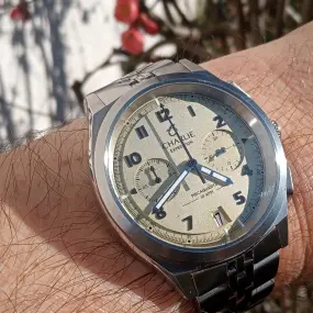 J'ai cherché longtemps avant de trouver cette belle tocante Enicar qui est une montre mécanique avec date. Elle est classique, belle mais imparfaite, ce qui en restitue toute sa beauté, presque intemporelle. Son mécanisme est fiable et sa réserve de marche très satisfaisante. Enicar reste une très bonne marque pour ceux qui aiment le vintage, des montres faites pour tous les amoureux nostalgiques de l'horlogerie suisse. Enicar veut dire racine en inversé. Cette tocante à mon poignet et là, il se passe vraiment quelque chose...