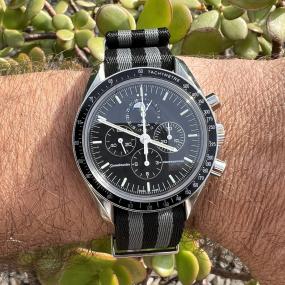 Mon attrait pour la Seamaster est né en 1995 à la sortie du film Goldeneye, 17ème opus du célèbre agent secret britannique 007, incarné par Pierce Brosnan. J'ai toujours été attiré par ce modèle, sans jamais l’essayer...jusqu'au jour où je saute le pas en passant devant une boutique Omega. J'essaye donc le modèle Seamaster 300M en 42mm de diamètre et là, grosse déception car la montre ne provoque rien en moi. Je la trouve un tantinet petite et manque de présence à mon poignet. Mais mon intérêt se porte immédiatement sur le modèle chronographe en 44mm qui se trouve en vitrine et là, le charme opère instantanément et j'ai un énorme coup de cœur pour ce modèle. A l'occasion de mes 40 ans, je cède au chant des sirènes (ce qui est de circonstance pour une Seamaster) et je m'offre ce modèle sur lequel j'avais jeté mon dévolu quelques années en arrière. Ce que j'aime sur cette montre, c'est un ensemble de choses. Tout d'abord, au niveau de l'esthétique, son cadran bleu sur lequel sont gravées des vagues donnant du relief et de la profondeur, ce même cadran qui est sublimé quand il est immergé dans son élément naturel, à savoir l'eau, dégage une nuance de bleus absolument magnifique. Puis on retrouve une lunette en céramique de couleur bleue, ainsi que des rappels de céramique bleue en guise de poussoirs du chronographe, cela est du plus bel effet. Le côté technique n'est pas en reste, avec le calibre automatique co-axial 9900 est d'une précision ultime car certifié master chronometer et approuvé METAS (avec la possibilité de télécharger le certificat de sa propre montre sur le site Omega). Il est d'ailleurs visible, car le fond de boîte est transparent et laisse contempler les côtes de Genève qui ornent les platines ainsi que la masse oscillante du mouvement, à l'instar d'une coquille de nautile. Toutefois, cette montre n'est pas exempte de tout reproche. Si sa taille m'a conquis (44mm de diamètre pour une épaisseur de 17.20mm), ces volumes risquent de ne pas être appréciés de tous et n'iront pas à tous les poignets. Rajoutez à cela, le poids de 211 grammes avec le bracelet en acier, on est clairement sur une montre massive mais jamais inconfortable ou gênante au porter. Raison pour laquelle, je la pare l'été d'un bracelet Nato Omega de la collection "summer blue", ramenant le poids à un plus "raisonnable" 134 grammes. Vous l'aurez compris, je suis subjugué par le panel de bleu émanant de ma Seamaster 300M chronographe (encore plus avec son Nato "summer blue") et l'émotion qui s'en dégage.