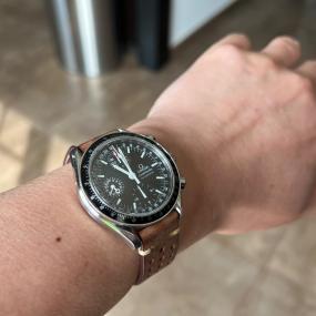 Cela faisait un moment que j'avais envie de faire mon premier "craquage" horloger. Je n'avais jamais dépensé plus de 700€ pour une montre, mais je sentais que le moment était venu de franchir le cap. En tant qu'amateur de chronographes, le choix évident était la Speedmaster d'Omega. Cependant, mon budget ne me permettait pas de m'offrir la célèbre MoonWatch, et je ne voulais pas me contenter de la petite soeur avec des couleurs traditionnelles. Je cherchais quelque chose de spécial, mais je ne trouvais rien qui me séduisait... jusqu'au jour où je suis tombé sur cette montre. Une Speedmaster Reduced avec un cadran en nacre! J'ai été immédiatement séduit par son élégance unique, et après une (très) courte réflexion, j'ai cédé. Je n'ai aucun regret. Le cadran change d'apparence selon la lumière qui frappe le verre hesalite, offrant une variété de nuances qui rend chaque regard vers mon poignet particulier. La précision de la montre est excellente, et malgré le cadran en nacre, elle reste étonnamment polyvalente. Les chiffres romains légèrement teintés de bleu ajoutent une touche d'excentricité, donnant davantage de vie à ce cadran. Le boîtier asymétrique de la Speedmaster reduced reste fidèle à son design emblématique, toujours aussi élégant et pertinent. Bref, je suis vraiment satisfait de cette montre, d'autant plus qu'elle date de l'année de ma naissance! Ma seule déception est de ne pas avoir trouvé un modèle avec un bracelet en acier d'origine (cette référence étant montée sur un bracelet cuir d'origine), mais ce petit détail n'a pas gâché mon plaisir.