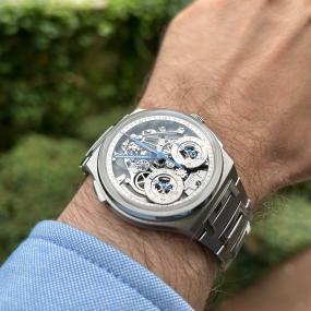En tant que grand ami de la marque fleurisanne, c’est naturellement que j’ai acquis leur nouveauté phare présentée aux Geneva Watch Days de 2021: la Tonda PF Micro Rotor. J’ai eu l’un des premiers modèles sortis de manufacture, qui tournait au ralenti à l’époque, Covid oblige. Cette montre est pour moi une sorte de quintessence de la sophistication derrière une apparente simplicité. Le cadran, finement guilloché « Grain d’Orge » joue subtilement avec la lumière qui vient taper dans les petits index, les aiguilles et le cartouche du logo. Le boîtier, de 7.8mm d’épaisseur, dispose d’une lunette moletée en platine, une touche de noblesse discrète connue de son seul propriétaire (attention néanmoins à ne pas la choquer, son remplacement est coûteux !). La couronne est vissée, offrant une étanchéité bienvenue de 100m, permettant un port quotidien. Cependant, sa petitesse peut la rendre un peu délicate à manipuler pour la mise à l’heure. Les cornes « Gouttes d’Eau » signature sont discrètement intégrées et sont affublées de 4 chanfreins. Le mouvement PF703 remplit parfaitement la boîte et offre de très belles finitions lui permettant de boxer dans la même catégorie qu’un 240 de chez Patek (guillochage « Grain d’Orge du micro-rotor en platine, Côtes de Genève, perlage et quelques anglages ici et là). Sa réserve de marche est de 48h. Mais la Tonda PF se distingue selon moi surtout par son bracelet, qui est je le pense l’un des tous meilleurs du marché. Ainsi, l’intégration est parfaite, les cornes venant se fondre dans les extrémités des maillons. Les finitions sont polies aux extrémités des maillons et brossées en leur centre. C’est discret et très bien exécuté. La chute est très bien maîtrisée. Le traitement de l’acier rend le bracelet très doux au toucher, offrant une belle expérience tactile. Il est aussi très flexible et a cette finesse lui donnant cet effet « seconde peau » si appréciable que l’on retrouve sur les plus beaux bracelets de la production, comme celui de l’Octo Finissimo ou des Patek Nautilus et dans une moindre mesure Cubitus. Le prix catalogue de la Tonda PF Micro Rotor est d’environ 25000 euros. Une somme rondelette mais qui je le rappelle est bien inférieure à ce que demande Patek pour sa Cubitus 5821 1A, Audemars pour sa 16202ST ou Vacheron pour sa 222, qui sont des concurrentes directes. La Tonda PF reste donc très bien placée tarifairement, offrant en plus une exclusivité sans précédent, les porteurs de Parmigiani étant rares et étant disponible en boutique immédiatement, ce qui ne gâche rien. Pour finir, la Tonda PF est une très belle création qui rejoint la C Bracelet de Romain Gauthier dans l’interprétation d’une montre sport chic aux finitions de premier ordre pouvant répondre à une demande croissante des clients, dans un contexte d’insécurité, pour du « quiet luxury ». Elle saura ainsi offrir à son propriétaire des prestations et une sophistication haut de gamme, connues de lui-seul. Et si une personne vient à la remarquer, nul doute qu’il s’agira d’un passionné, offrant là l’opportunité pour un bel échange.