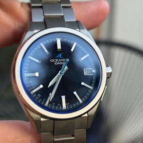 Tout d'abord on est hypnotisé par le cadran grainé dans un vert fumé. La lisibilité y est excellente grâce à sa "crosshair", ses index blancs en sandwich et ses aiguilles blanches. Le disque de date à 6h est particulièrement bien intégré puisqu'il est de la même couleur que le cadran. Ensuite nos yeux sont attirés vers la lunette cannelée qui rappelle les pales d'une turbine de jet (ou de l'Oris Propilot au choix). Parlons à présent de ce boitier bien proportionné de 41mm en titane avec une belle couleur caractéristique de ce métal, normalement cette matière marque vite, mais il se trouve que RZE y a appliqué un traitement de surface pour améliorer sa dureté est étonnement légère et résistante aux petites agressions de la vie. Les cornes sont très bien sculptées et ces 3 facettes donnent l'impression qu'elles sont plus fines qu'elles ne le sont en réalité. Il ne reste plus qu'une chose à voir la couronne vissée avec son logo. Surdimensionnée elle permet une excellente prise en main. A noter un signe particulier que je n'ai vu que sur ce modèle il y a une sorte de tube rouge qui peut servir de détrompeur lorsque la couronne n'est pas vissée. Le bracelet en titane est très confortable et ne se raye pas. Il est également doté de multiples possibilités de micro-ajustements. Côté mouvement on a un Seiko NH35 basique qui fait très bien le job. Cette montre est très bien réalisée par RZE qui est une jeune marque Singapourienne et dont les propriétaires ont l'air de beaucoup aimer les objets un peu lifestyle et baroudeurs tels que les montres, stylos, couteaux tous en titane. Bref je l'aime beaucoup cette montre en titane. Sa légèreté, sa résistance et son look sobre et magnifique en font une superbe montre sport chic à porter tous les jours et pour un prix assez contenu vu les matériaux utilisés.