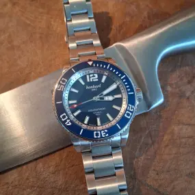 SICURA Globetrotter 21 rubis à remontage manuel. Il s'agit d'une montre des années 70 très atypique grâce à sa triple aiguille des heures et sa lunette colorée. En effet, au delà de l'aiguille classique, on trouve également une aiguille GMT et surtout une improbable aiguille NYT (New York Time). Elles fonctionnent ensemble lors de la mise à l'heure. Le boitier de 41mm accueille un très beau cadran noir avec points et chiffres tritium ainsi qu'un guichet de date à 3h. La lunette bi-directionnelle jaune et bleue en aluminium permet de connaitre l'heure des 24 villes inscritent dans le réhaut. Le fond de boite reprend les traditionnelles armoireries de la marque. Le mouvement reste bien souvent le point négatif de Sicura puisque leur objectif était de proposer des montres Suisse à moindre coût. Mon exemplaire embarque un modeste calibre EB 8027 (Ebauches Bettlach). A noter qu'il existe également des versions automatiques. Lors d'une vente aux enchères, son originalité, sa lunette colorée et ses magnifiques aiguilles m'ont séduites.