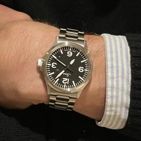 Mais bien sûr ce cadran... En vraie, il apparait moins "en rouge et noir" mais plutôt comme un dégradé de marron à orange, ce qui explique qu'on la surnomme NEGRONI, comme le cocktail à base de gin, de campari et de vermouth rouge. J'étais attiré par le modèle 556 de Sinn, le plus épuré de la marque, le plus lisible, la tool watch par excellence que l'on peut porter partout et en toute circonstances, mais le cadran noir classique me semblait un peu trop... classique. Sinn sort régulièrement des variantes de son best seller. Quand j'ai vu cette édition limitée à 200 exemplaires, j'ai tout de suite craqué. Pas de date, des index bâton (que je préfère aux gros 3-6-9-12), pas de littérature inutile, et le bracelet en acier à 5 mailles qui a également ma préférence. Le cadran et l'exclusivité ont malheureusement un prix puisqu'il faut ajouter 800 euros par rapport à la version classique. Les proportions sont parfaites, elle est très agréable à porter grâce au bracelet jubilé qui épouse le poignet, et ses cornes courbes. Le boitier en acier satiné est massif, et le renflement au niveau de la couronne, lui confèrent un coté très "industriel", qui me fait penser à une arme de guerre allemande, sobre et efficace. Mais, grâce à la délicatesse du cadran soleillé, la rigueur germanique s'estompe, et le gentleman italien peut faire tourner les glaçons dans son verre à cocktail. La montre est étanche à 200 mètres, la couronne est vissée, l'heure est très lisible de jour comme de nuit, la dérive est de quelques secondes par mois. Le fond transparent verre saphir laisse apercevoir un mouvement sobrement décoré, mais joli. La boite est bien finie, elle comprend des pompes, un flacon d'huile, et un bracelet supplémentaire en cuir de veau noir avec l'outil qui va bien. Santé !
