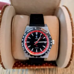 J'aime beaucoup cette montre Yema qui est emblématique de la marque et qui fait référence à la course automobile et la bd Michel Vaillant...elle a un mouvement à Quartz mais c’est une montre avec un calibre Seiko V64 Mechanique quartz hybride à 32,768 Hz de fréquences ,Lunette tachymétrique en aluminium brossé.