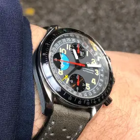 L'aspect pratique de la fonction GMT résonne en moi, ce qui m'a conduit à rechercher en permanence une montre GMT abordable mais louable. Je me souviens avoir lu une critique sur "Beyond The Dial" de cette montre intrigante de Yema, évidemment bien connue en France mais pas particulièrement pour moi. J'ai été séduit par l'opportunité de combiner mes besoins pour une GMT et mon amour pour la France... Appréciée des amateurs de montres pour son héritage, Yema a encore élargi son répertoire avec cette GMT, complétant évidemment son esthétique emblématique de Superman par une diversité fonctionnelle et une touche de couleur sur les lunettes. J'ai choisi l'acier inoxydable de 41 mm, offrant une remarquable résistance à l'eau de 500 mètres, renforcée par une couronne redessinée et un fond de boîtier renforcé. Deux options étaient sur la table concernant la lunette, et j'ai décidé d'opter pour la lunette bleue et grise de style "Batman" qui met en valeur l'aiguille des secondes rouge et l'étiquette 500 mètres. Le choix des tailles penche vers le 41 mm, qui offre de meilleures proportions... C'est pour moi, bien sûr. Même si je ne l'ai pas testé, je pense que c'était un bon choix. Les montres sont dotées d'une lunette en verre saphir qui, tout comme les aiguilles et les index, est traitée avec du Super-LumiNova pour une meilleure lisibilité en basse lumière. Le mécanisme de verrouillage de la lunette GMT, repris de leurs anciennes montres de plongée, fait l'affaire d'un point de vue design mais peut être redondant d'un point de vue utilisation. Le calibre semble être le YEMA3000 GMT de manufacture, un mouvement robuste avec une réserve de marche de 42 heures et un réglage indépendant des aiguilles GMT. Il fonctionne plutôt bien, évidemment, même si je ne m'attendais à rien de particulier du point de vue de la précision. D'après ce que j'ai lu récemment, Yema a fait un grand pas en avant avec quelques calibres maison supplémentaires en partenariat avec Olivier Mory... La portabilité est un point fort important, avec deux options de bracelets ou un bracelet en acier. J'ai porté les deux et, comme vous pouvez le voir sur mes photos, j'ai fait mien le bracelet Tropic. Pour un peu plus de 1000 USD, cette Yema est une évidence, faisant le job avec son charme vintage.